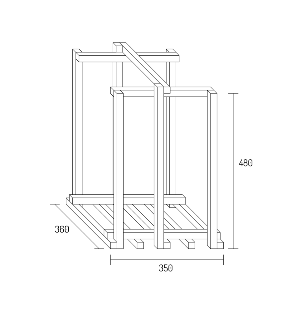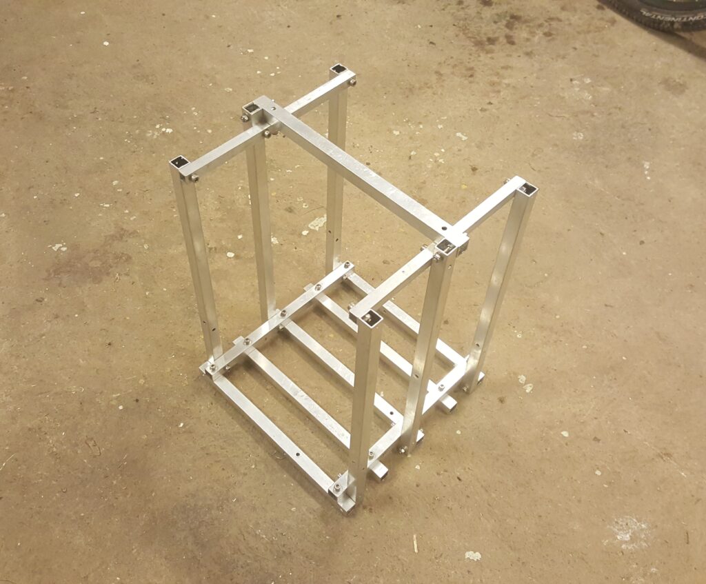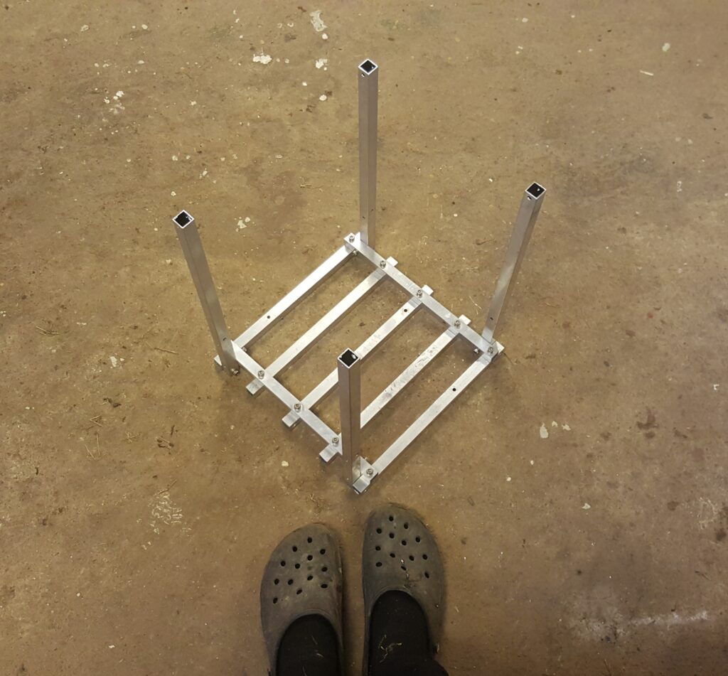 Vagnen behövde en vedkorg som får plats bredvid kaminen. En som inte står och dräller mitt på golvet. En som inte är gjord i brännbart material. Och från bygget av storkärran fanns det lite spillbitar av aluminiumprofilrör kvar.