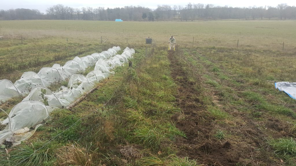 Men först behövdes det ett slätt regelverk att spika upp masoniten på. Valbenen kläddes därför i smala panelbrädor, 22×45, som samtidigt skapade en luftspalt mellan ytterpanelen och isoleringen. Spikbanden som jag dömde ut som meningslösa i förra inlägget, fick här också ett litet syfte i att hålla isoleringen på plats så att den inte ska ramla ut mot masoniten.