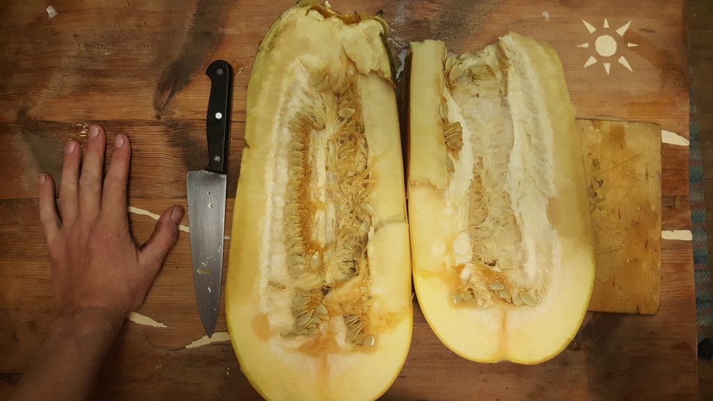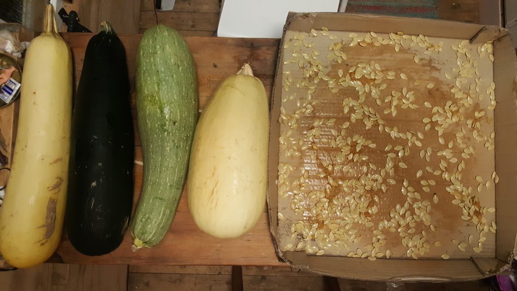 Praktexemplaren har legat utanför vagnen i väntan på att motivationen att torka kärnorna skulle infinna sig. Det gjorde den ikväll, när jag upptäckte att den största Anja-squashen börjat mjukna.